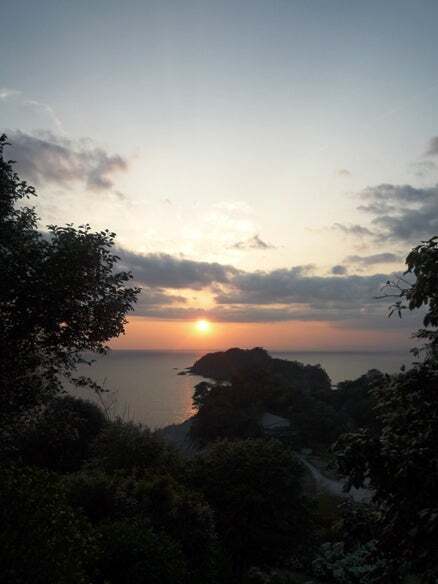 西伊豆の常宿「天遊」の女将と手下達 西伊豆の演奏を終えた瞬間の夕陽