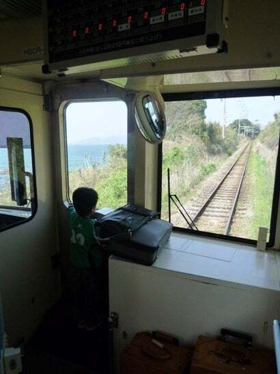 薩摩川内の女将は御休みだったけど演奏は無事終わり、あのオレンジ鉄道に乗って森進一の故郷から八代亜紀の故郷へ。この車窓の海は最高だよ~。な、少年。