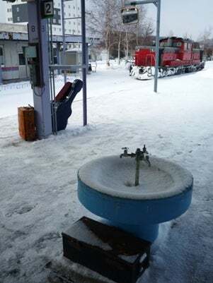 雪不足だったこの年、富良野には沢山ありました。ホームは屋根の下も雪です。