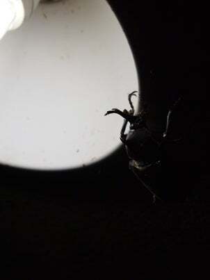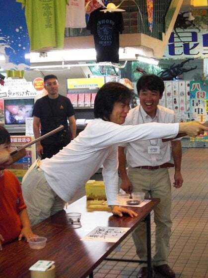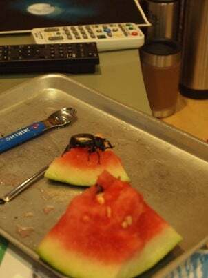 打ち上げに遊びに来たカブトムシさん。スイカで接待。