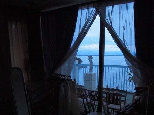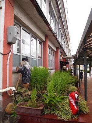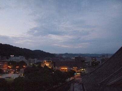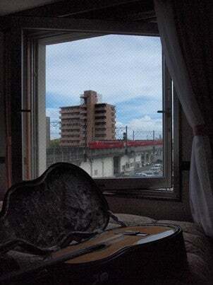 久しぶりに来た宮崎、宿の窓の平行線に線路、眼下にかかし、集中豪雨
