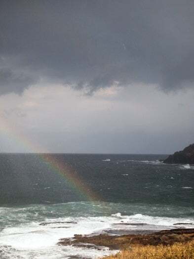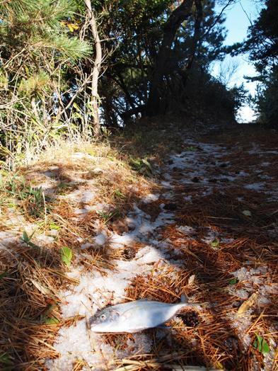 海でチラシ用画像の撮影。終わった途端に雨で虹で、道端には魚がいて