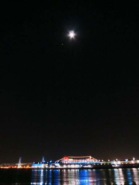 稲佐の浜の太陽と海に月も堂々と加わって夜が訪れる。