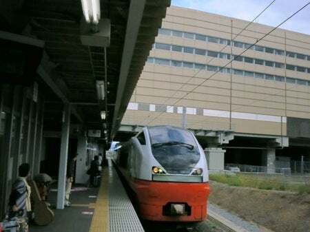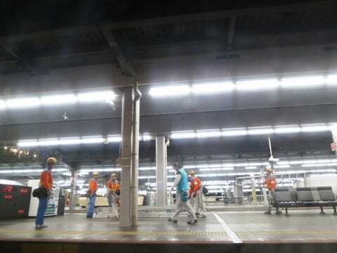 深夜の車窓は月明かり。深夜の駅は作業中。おつかれさま(^^rJRカラーの特急回送とすれ違えば東京はもうすぐ