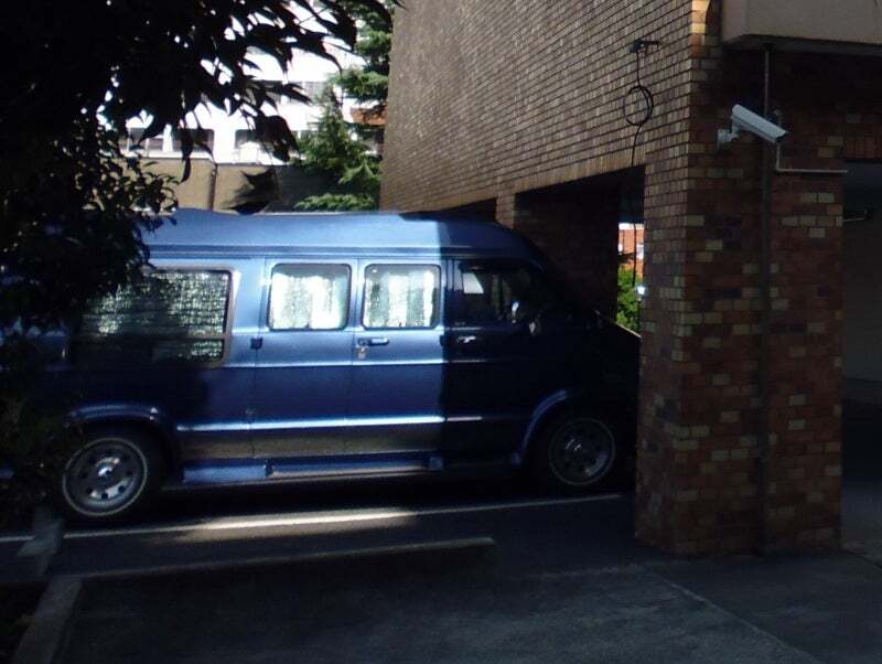 さて、新OKカンパニーの駐車場は当初、15cmの段差を乗上げた瞬間3cmで止めないと後ろの壁にぶつかる場所だったので管理人さんが「こっちどお?」と勧めてくれた場所。よし後ろOK!ん?高さも幅も1cmの隙間だ。ドアが、、。
