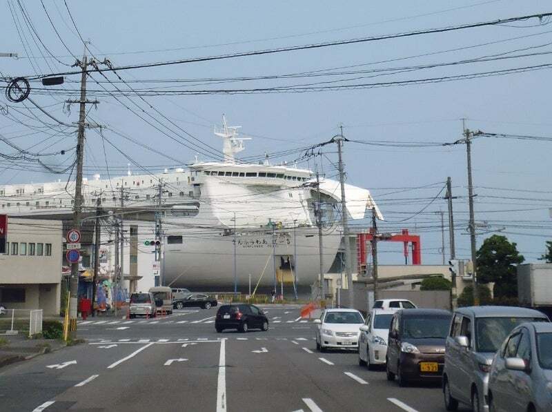 大分は乗り場が移ったからか街から見るとフェリーが道を走ってる存在感!