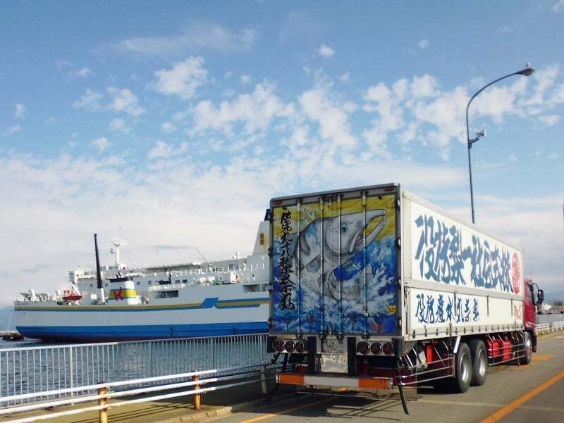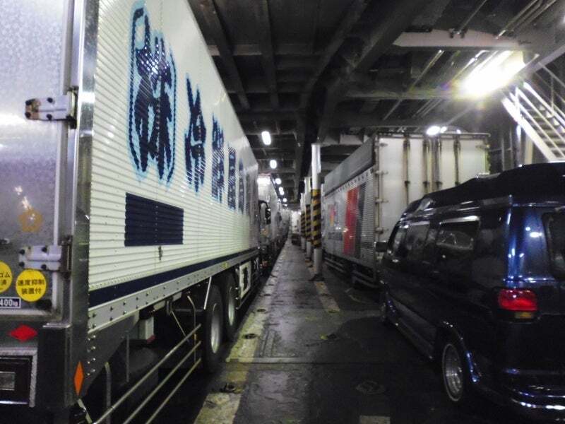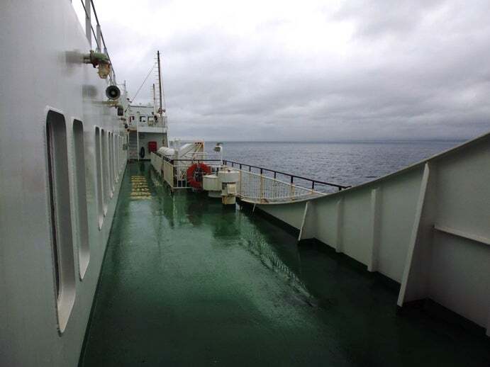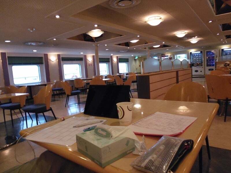 僕が帰るのを惜しむようにそぼ降る雨の港を出港すれば季節外れの船内食堂は貸切状態。OKカンパニーオフィースになっております。